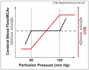 El cerebro es un órgano con funciones complejas. Debido a su joven filogenia, en especial algunas estructuras (lóbulos frontales), los ajustes en la perfusión son al mismo tiempo sofisticados y vulnerables. El flujo cerebral tiene un mecanismo de autorregulación que le permite mantener una perfusión constante acorde con las demandas metabólicas en un amplio rango de PA (desde PAM 60 a 150 mm Hg) que incluso no es homogéneo en todo el cerebro. El envejecimiento arterial conlleva la pérdida de fibras elásticas, el reemplazo por fibras colágenas y como consecuencia mayor rigidez y menor distensibilidad de las arterias (incremento VOP y PP). Sumado al envejecimiento, la injuria vascular cerebral (IVC) (infartos lacunares, lesiones de sustancia blanca y microhemorragias) coadyuvan a que el flujo se vuelva dependiente de la presión arterial de manera que, la meseta de la curva se transforma en una relación lineal. Por lo tanto, cuando nos referimos al órgano cerebro cambia el foco de atención, debido a que la PAS excede el riesgo de la PAD. Las caídas en la PAD no afectan el flujo cerebral, siendo el valor de 60 mm Hg (demostrado por ultrasonografía Doppler y espectroscopía) la explicación por que no conocemos el punto J de la PA en el cerebro. Así, lo que varía no son las curvas en cada órgano, sino los “rangos J”. Motivo por el cual, la discusión debería centrarse en;si alcanzar el punto J para proteger un órgano es compatible con la práctica clínica para con el resto de los sistemas. En otras palabras, el rango de valores de una curva J podría beneficiar un órgano (cerebro) en tanto perjudicar otro (corazón). En este caso “lo que es bueno para el cerebro, no parece ser tan bueno para el corazón”. En la actualidad, la evidencia médica nos dice que, la PA por encima de 110-75 mm Hg incrementa el número de AVEs (Lancet 2002;360:1903-13).